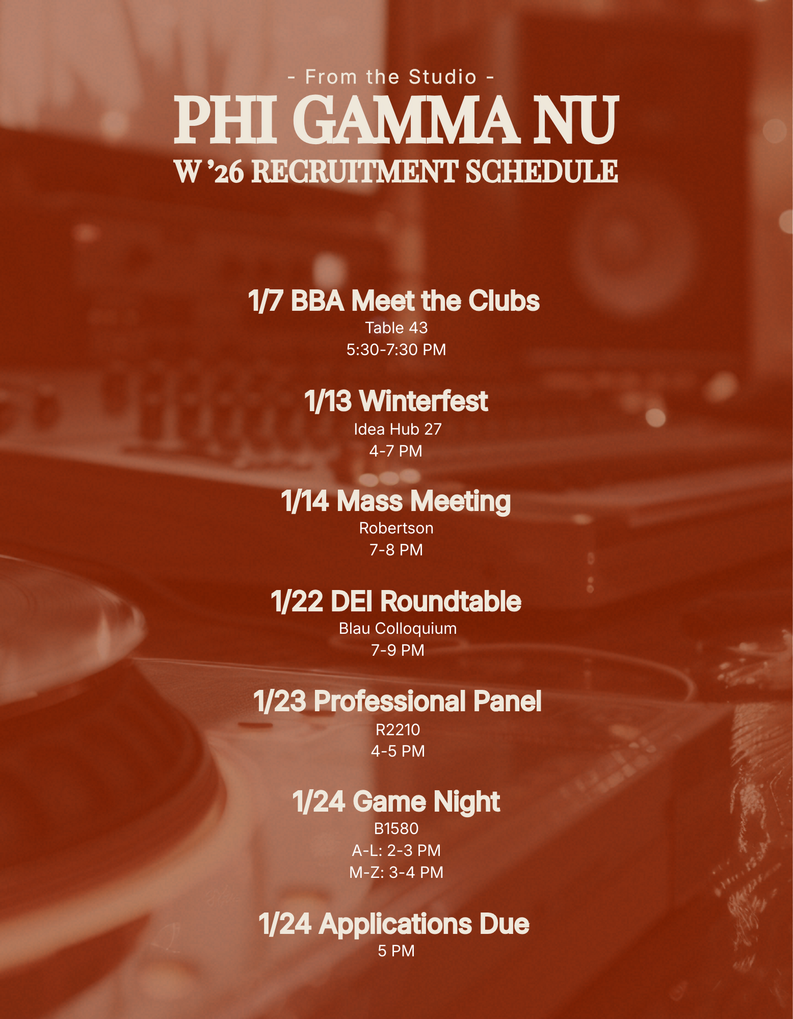 Just as with our belief in majors, we believe that there is no mold for a typical brother in PGN. There is no expectation for you to already know every aspect of the professional fields, but good business acumen is beneficial. We want to see your interest in how you can change the business world for the better, as well as a genuine commitment to the brotherhood.